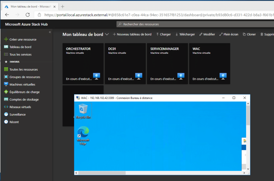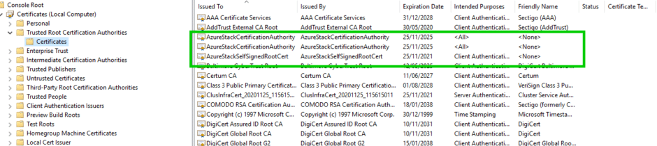 Sur votre poste client il faudra importer les certificat racine de l’infra ASDK au sein de vos Trusted Root Authorities préalablement exportés du serveur hôte ASDK (sinon ça ne marche pas bien…):