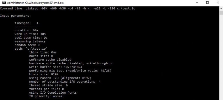diskspd -b8K -d60 -W30 -o4 -t8 -h -r -w25 -L -Z1G c:\test.io