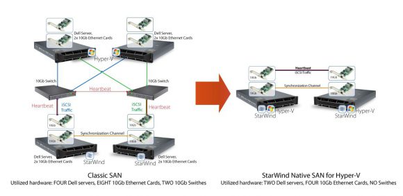 StarWind Native SAN for Hyper-V est une excellente solution pour vous si vous souhaitez profiter pleinement des fonctionnalités de Live Migration et la haute disponibilité , mais ne voulez pas dépenser de l’argent sur du matériel coûteux SAN. StarWind SAN permet la mise en miroir (raid 1) du le stockage interne entre vos hyperviseurs, ce qui rend cette solution abordable pour la petite et moyenne entreprise.